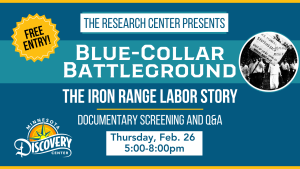 Join us at the Minnesota Discovery Center for the next installment of our quarterly event series, The Research Center Presents. On Thursday, February 26, we’re screening Blue-Collar Battleground: The Iron Range Labor Story, a 30-minute documentary exploring Iron Range labor history from the early 1890s through World War II.
